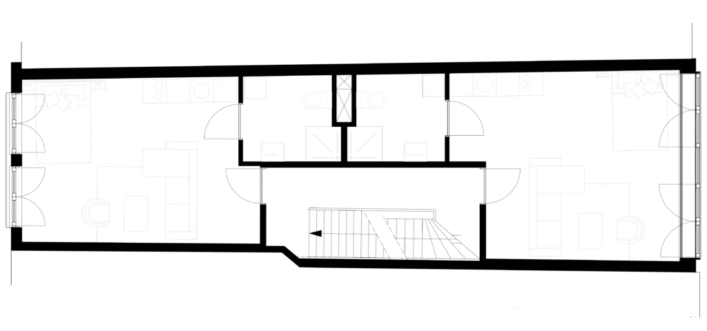 Het diepe pand bood ruimte om zowel aan de voor- als achterzijde woningen te realiseren, waardoor de studio’s optimaal profiteren van het uitzicht over de stad. Er is gekozen voor compacte, hoogwaardige studio’s die inspelen op de stedelijke vraag. Het trappenhuis lijkt op het eerste gezicht behouden, maar is in werkelijkheid volledig nieuw en verder naar achteren geplaatst. Zo ontstond voldoende entreeruimte voor de woningen en de meterkasten, terwijl het trappenhuis de centrale ontsluiting van het gebouw vormt.