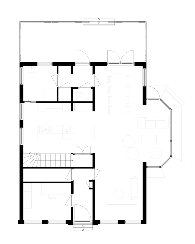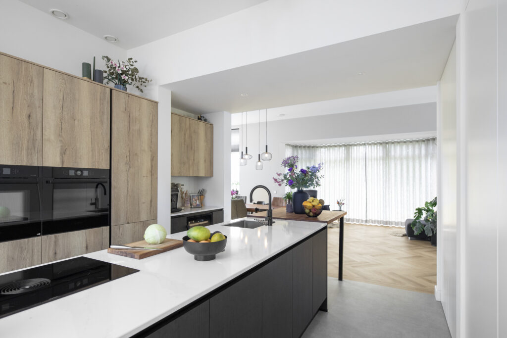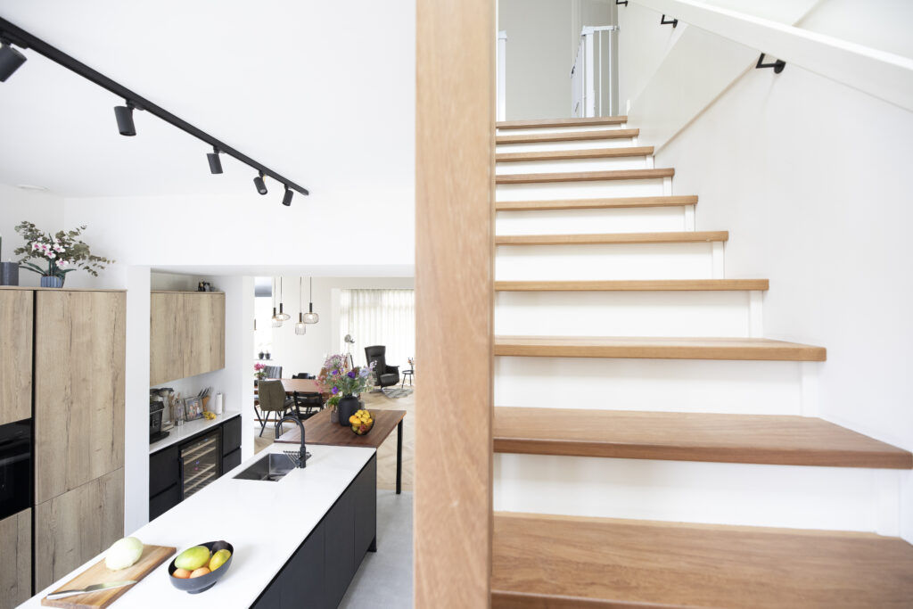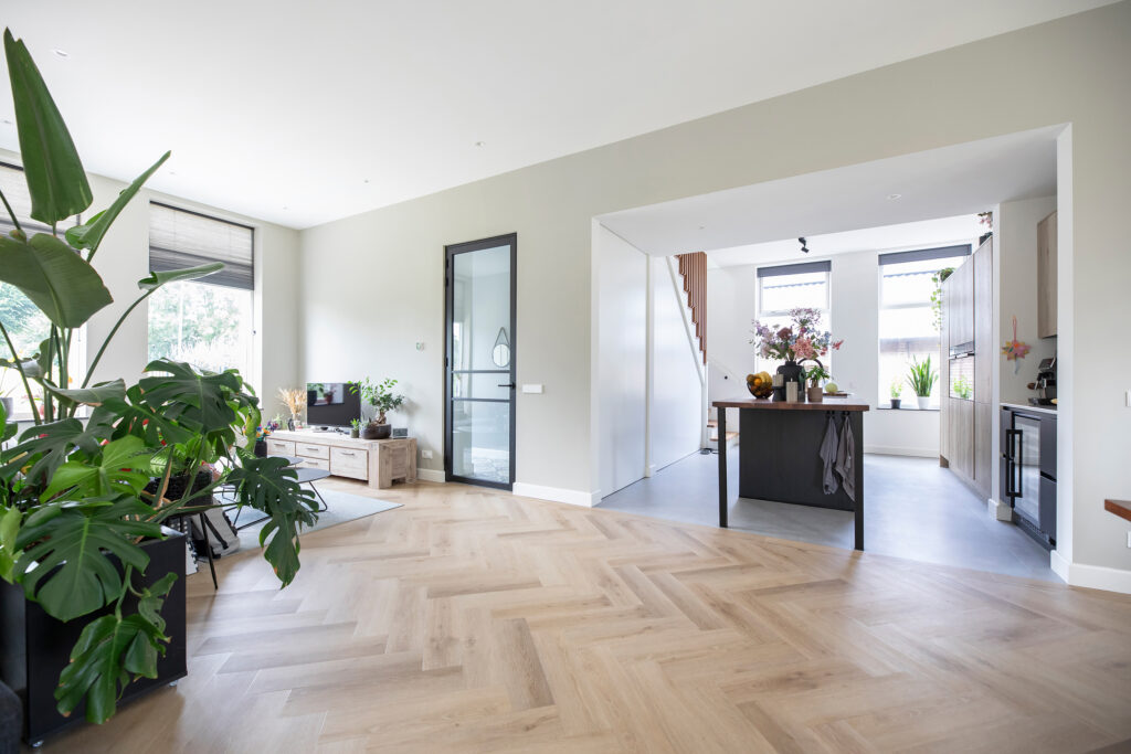 Op de begane grond is gekozen voor een moderne, open woonkamer met een ruime keuken en aanzienlijk minder gangruimte. Hierdoor is de leefruimte sterk vergroot. De woonkamer heeft nu aan vier zijden lichtinval, wat zorgt voor een lichte en open sfeer. Op de verdieping zijn alle slaapvertrekken samengebracht, waardoor een efficiënte en comfortabele indeling is ontstaan. Het interieuradvies van MCK sloot hier naadloos op aan en gaf de woning een eigentijdse uitstraling binnen het monumentale karakter.